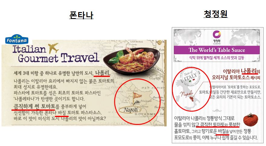 샘표 측이 제시한 증거자료에 따르면 문제가 되고 있는 두 제품의 콘셉트는 유사한 부분이 여럿이다. 그것은 폰타나 페이스북 및 홈페이지, 두 제품의 뒷면 문구 비교, 프로모션 행사 현장 배너 등을 보면 확인할 수 있다.