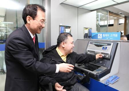 [CEO와소비자=김동욱 기자] 외환은행은 휠체어를 이용하는 고객들이 실질적으로 자동화기기에 보다 쉽게 접근해서 이용할 수 있도록 본점 영업부에 휠체어고객용 자동화코너를 설치했다고 15일 밝혔다