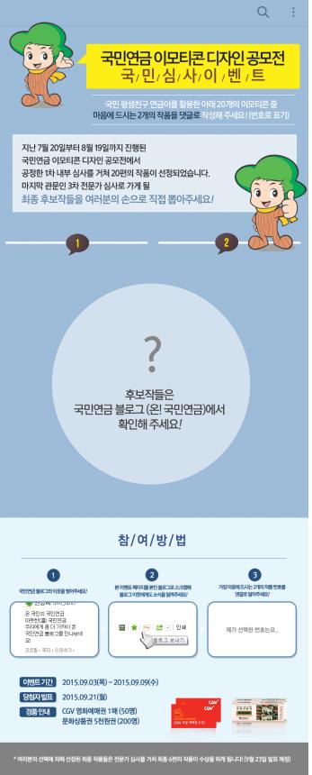공단은 3일부터 9일까지 공단 블로그 ‘온!국민연금(http://blog.naver.com/pro_nps)’을 통해 ‘이모티콘 디자인 공모전’ 국민심사를 실시한다고 밝혔다.