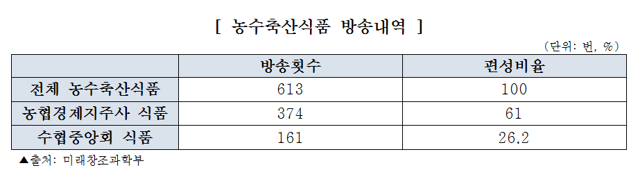 공영홈쇼핑은 7월 14일 개국 이후 총 613번의 농축수산식품을 방송했는데, 이 중 농협경제지주사가 벤더로 참여한 상품을 387번, 수협중앙회가 벤더로 진행한 상품을 161번 판매한 것으로 나타났다. 또한 공영홈쇼핑이 개국 이후 매출의 상당부분이 농축수산품이었다. 개국 이후 매출은 223억원(8월 20일 기준)이었으며 이 가운데 약 90억원이 농축수산품 매출이었다.