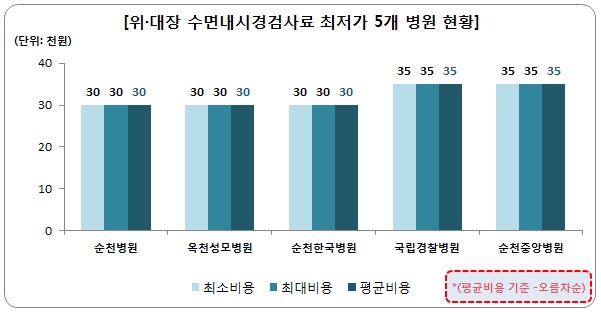 위·대장 수면내시경 검사료가 가장 저렴한 곳은 전남 순천시 소재 순천병원과 순천한국병원 그리고 충북 옥천군 소재 옥천성모병원이었다. 이들 병원의 검사비용은 3만원으로 전체 평균 비용의 3분의 1수준에도 못 미쳤다.
