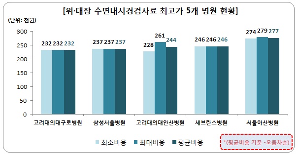 14일 보건의료 분석평가 전문사이트인 팜스코어가 건강보험심사평가원의 최근(2015년 9월 11일 기준) 비급여 진료비 정보를 토대로 국내 종합병원이상 314개 의료기관(종합병원 272곳, 상급종합 42곳)의 위·대장 수면내시경 검사료를 분석한 결과, 검사료가 저렴한 곳은 평균 3만원 정도였지만, 비싼 곳은 27만원이 넘는 것으로 나타났다.