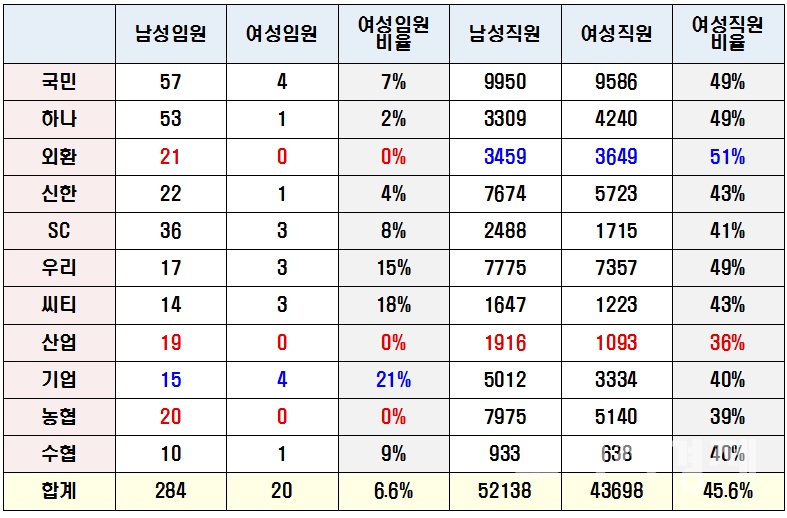 11개 은행, 전체 304명의 임원 중 여성임원은 총 20명(6.6%)에 불과했다. 산업은행과 농협, 외환은행에는 여성임원이 한 명도 없었고 하나은행(2%)과 신한은행(4%), 수협(1%)은 각 1명의 여성임원이 재직 중이며, 기업은행이 4명(21%)로 가장 많았다.