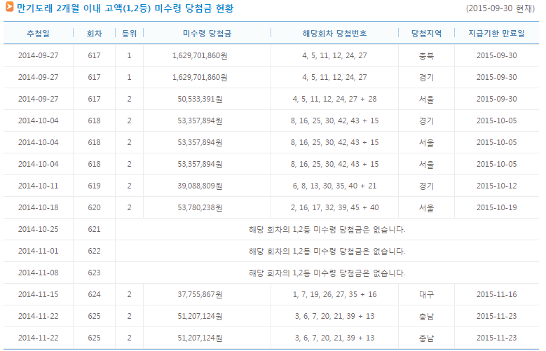 지난 617회차 1등 당첨자 중 2명, 그리고 2등 당첨자 중 2명이 지급기한 만료일인 2015년 9월 30일까지 당첨금을 수령하지 않아 지급자격을 박탈당한 어이없는 뉴스도 있다.