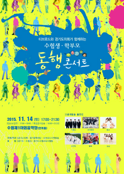 [소비자경제=백연식 기자] 티브로드는 경기도 의회 경기문화재단과 함께 오는 14일 수원시 팔달구 인계동에 위치한 수원 제1 야외음악당에서 오후 5시 30분부터 9시 30분까지 4시간에 걸쳐서 2015년도 대학수학능력시험을 본 ‘수험생들과 학부모들을 위한 동행콘서트’를 진행한다.