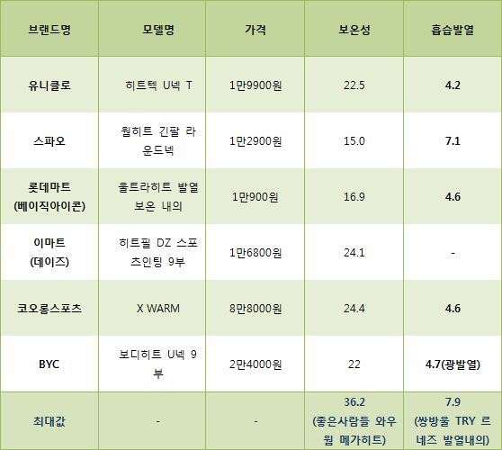 반면 보온 기능이 낮은 제품은 흡습발열과 반대로 쌍방울 르네즈 TRY발열내의였다. 이밖에 남영비비안 마이크로 모달, 비너스 플라이히트 등 얇은 제품이 대체로 보온성이 떨어졌다.