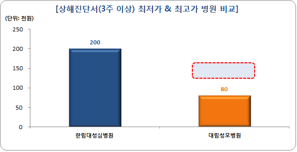 일부 병원은 지역과 등급이 같은데도 상해진단서 비용에서 큰 차이를 보였다. 경기소재 같은 상급종합병원인 한림대성심병원의 상해진단서 비용은 20만원이었으나, 순천향대부천병원은 10만원으로 그 격차는 2배에 달했다.