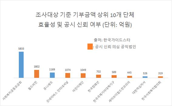 공익법인 재정내역을 분석·공개하는 한국가이드스타가 지난해 이어 올해도 대대적인 조사에 나섰다. 대형 공익법인들의 기부금 사용 실태를 효율성·투명성 지표로 살펴본 결과 신뢰도는 낙제점에 가까웠다.