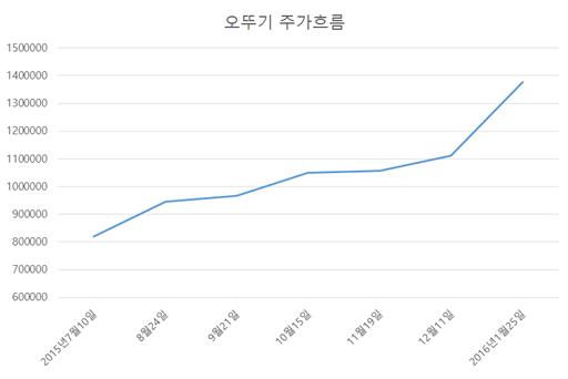 오뚜기의 주가는 진짬뽕을 출시한 한 지난 10월 15일 종가 기준 105만1000원이었지만 1월 말 현재 주가는 137만원~142만원을 오르내리고 있다.