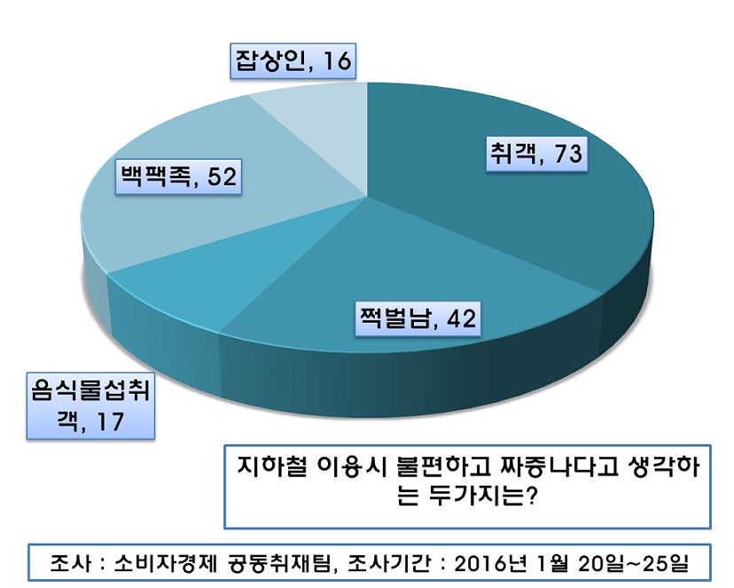 ‘지하철 이용시 불편하고 짜증나다고 생각하는 두가지는 무엇인가’라는 질문에 답변자 중 73명은 ‘취객’을 꼽았다. 이어 ‘백팩족’이라고 답한 사람 52명, 쩍벌남(42명)과 음식물섭취객(17명), 잡상인(16명)이 뒤를 이었다.