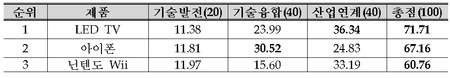 먼저, LED-TV, 아이폰, 닌텐도 위 등 시장을 선도하는 대표적 융합제품들을 대상으로 융합지수를 측정한 결과, 우리나라의 대표적 시장선도제품인 LED-TV의 융합지수(71.71)가 아이폰(67.16)이나 닌텐도 위(60.76)보다 높은 것으로 나타났다.