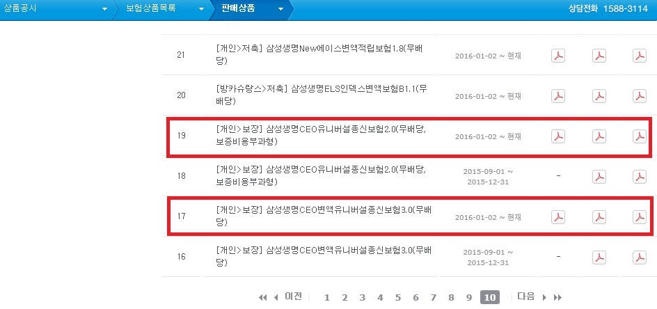문의결과 삼성생명 관계자의 답변은 잘못된 것으로 나타났다. 삼성생명 홈페이지 공시실에 게재된 보험상품 판매목록에는 ‘삼성생명 CEO유니버설종신보험2.0(무배당,보증비용부과형)’과 ‘삼성생명 CEO변액유니버설종신보험3.0(무배당)’ 두 상품의 상품요약서와 약관이 제대로 올라와있었다.