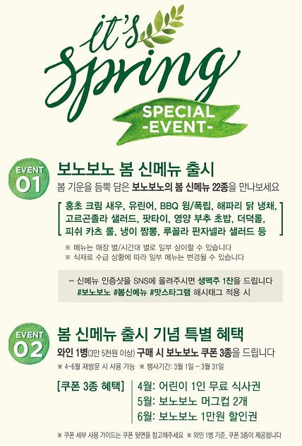 봄 신메뉴 출시 기념으로 31일까지 와인 주문 고객을 대상으로 쿠폰북을 제공하며 4~6월 재방문 시 월별로 어린이 1인 무료, 보노보노 머그컵 증정, 1만원 금액 이용 등 다양한 혜택을 제공한다.