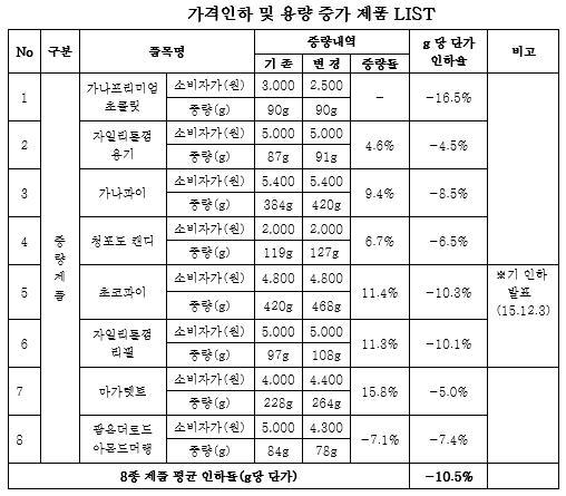 이들 제품은 가격을 기존 그대로 유지해 g당 가격 인하율은 자일리톨껌 용기 4.5%, 가나파이 8.5%, 청포도 캔디 6.5%이다.