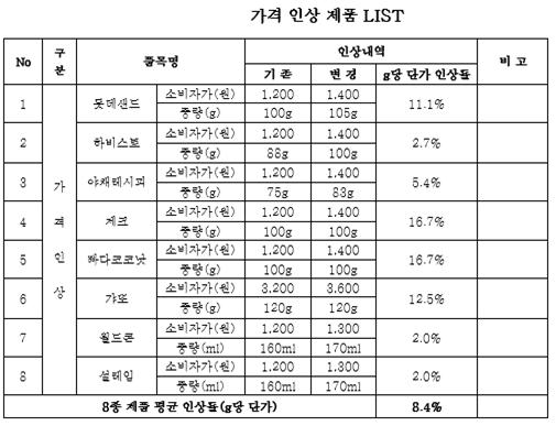 마가렛트는 품질 개선을 위해 개당 중량을 9.5g 에서 11g으로 늘려 크기를 키우고, 가격을 4000원에서 4400원으로 변경해 g당 단가를 5% 인하한다. 팜온더로드 아몬드머랭도 가격을 5000원에서 4300원, 중량을 84g에서 78g으로 낮춰 g당 단가를 7.4% 인하하기로 했다.