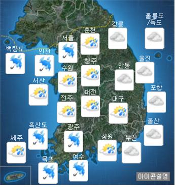 비는 아침까지 소강상태를 보이지만 돌풍과 함께 천둥·번개가 치는 곳도 있겠다.