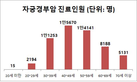 20대 자궁경부암 환자수 역시 전체 연령대에서 차지하는 비중은 3.9%로 낮았지만, 이 연령대 암 환자수 대비 자궁경부암 환자수는 11.9%로 평균보다 4.9%포인트나 높았다.