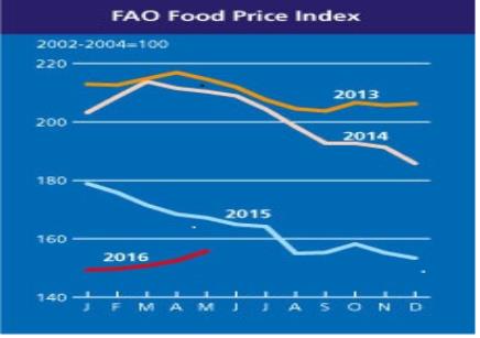 이로써 식량가격지수는 지난 1월 이후 4개월 연속 상승세를 유지하고 있다. 지난해 같은 달보다는 6.8% 하락한 수준이다.