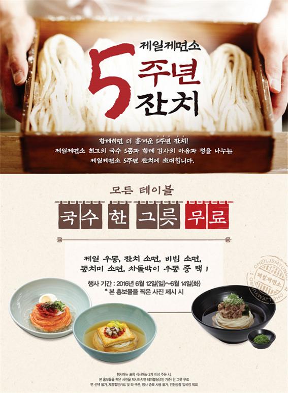 ‘제일제면소 5주년 잔치’라는 이름으로 마련한 이번 행사는 인기 면요리 증정 및 세트메뉴 30% 할인 판매로 이뤄진다.