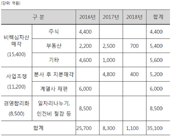 또한 일부 제품사업의 분사 후 지분매각 및 계열사 재편 등 사업조정을 통해 1조1000억원을 확보할 방침이다.