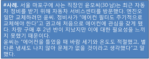 최근 자동차업계에 따르면 무더위를 앞두고 차량 에어컨을 사용하는 운전자들이 늘고 있지만 윤씨와 같이 에어컨 점검에는 전혀 관심이 없는 이들이 여전히 많다. 이는 운전자들이 에어컨 바람이 시원하게 느껴지지 않을 때와 에어컨에서 악취가 날 때 등 특별한 상황을 제외하고는 에어컨 점검 필요성을 못 느끼기 때문이다.
