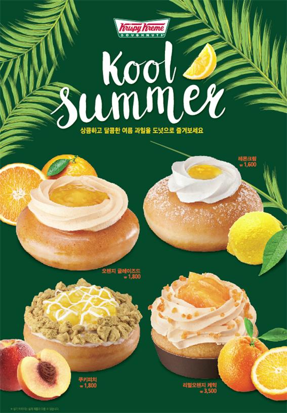 이번에 선보이는 ‘쿨 썸머 도넛’ 4종은 ‘오렌지 글레이즈드’, ‘레몬크림’, ‘쿠키피치’, ‘리얼 오렌지 케익’으로 구성됐다.