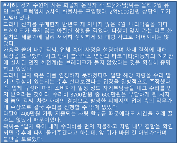 실제로 한국소비자원의 한 관계자는 “화물차 운전자와 같은 개인 사업자는 소비자에 포함되지 않는다”고 말했다.