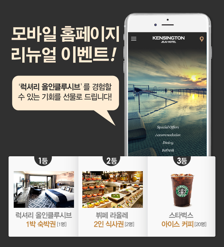[소비자경제=이지연 기자] 이랜드의 켄싱턴 제주 호텔에서 모바일 홈페이지 리뉴얼 오픈 기념으로 ‘모바일 홈페이지 리뉴얼 오픈 이벤트’를 진행한다.