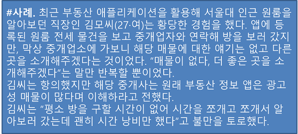 그러나 이와 관련된 소비자들의 피해 또한 늘어나는 추세다. 특히 앱에서 확인했던 매물이 실제와 일치하지 않는 경우가 많아 소비자들이 불만을 토로하고 있다.