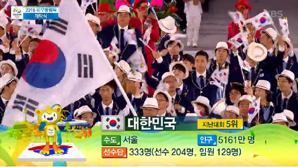 한국은 펜싱 국가대표 구본길(27·국민체육진흥공단)이 기수를 맡았고 정몽규 선수단장, 남녀 주장인 진종오(37·KT), 오영란(44·인천시청) 등을 필두로 약 50여 명의 선수단이 행진했다.