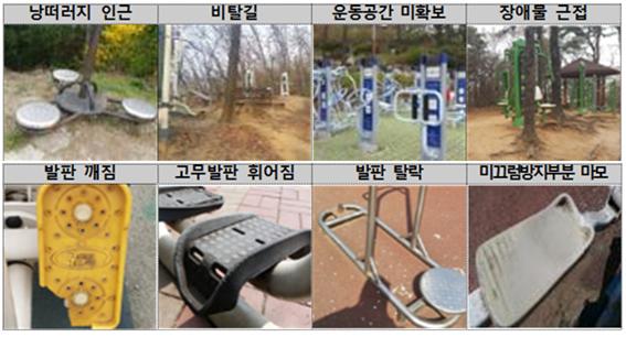 조사대상 50곳 중 28곳(56.0%)은 기구가 고장 또는 파손돼 있었고, 20곳(40.0%)은 기구의 고정이 불안정해 흔들리는 상태로 방치돼있었다. 또한 13곳(26.0%)은 기구 발판의 미끄럼 방지처리가 안 되어 있거나 마모되어 있어 이용 시 미끄러지거나 떨어질 우려가 있었다.