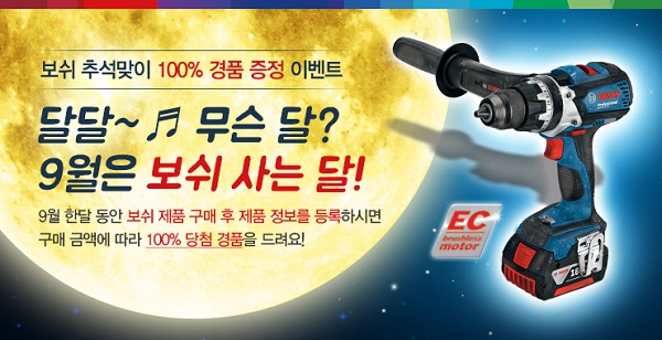 [소비자경제=정명섭 기자] 보쉬 전동공구 사업부가 한가위를 맞이해 보쉬 자사 제품을 구매하고 제품등록 페이지를 통해 등록한 소비자에게 100% 경품을 증정하는 ‘보쉬 브랜드 대전’ 행사를 9월 한 달 간 진행한다고 8일 밝혔다.