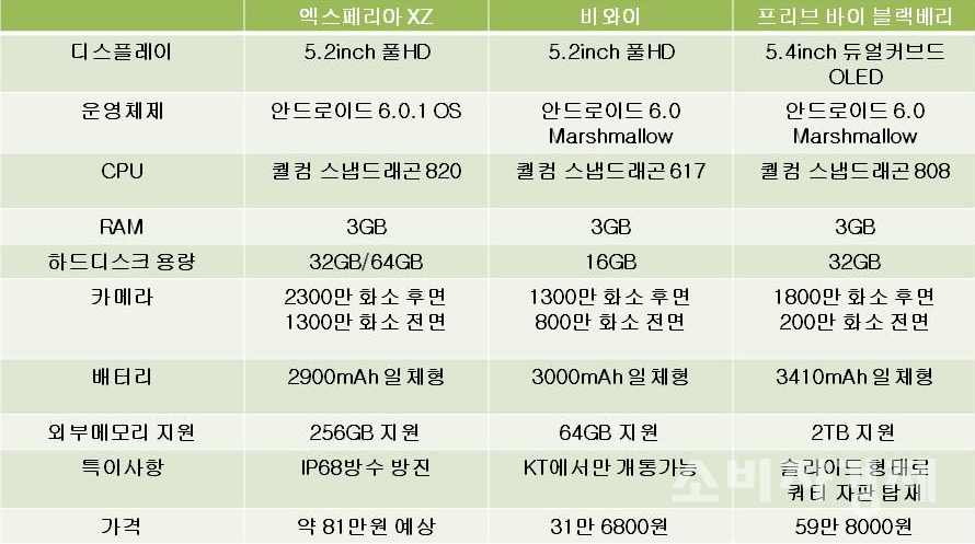 블랙베리 출고가는 작년말 북미에서 출시된 699달러에서 출시 시점이 꽤 지난것으로 인해 59만8000원으로 저렴하게 국내에서 출시될 예정이다. 엑스페리아XZ의 예정 출고가는 엔화 약 7만 6천엔(한화 약 81만 원)으로 예상된다. 화웨이의 비와이 출고가는 31만 6800원이다.