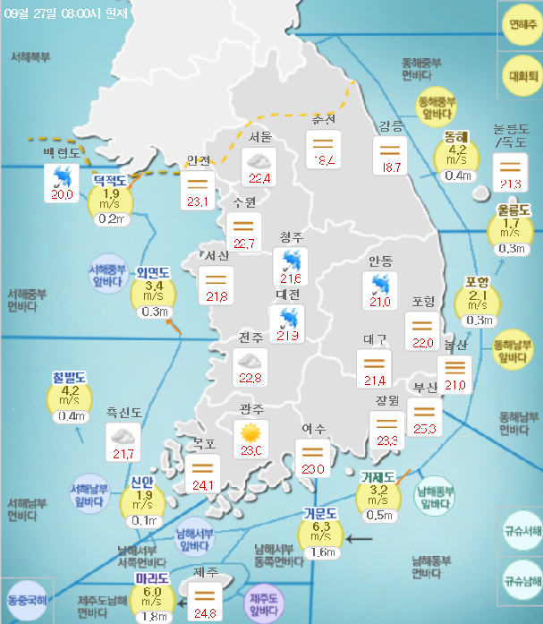 중부지방은 가끔 구름이 많다가 점차 맑아지겠으나, 남부지방과 동풍의 영향을 받는 강원영동은 대체로 흐리고, 강원영동과 경상도는 아침까지, 제주도는 낮까지 비가 오는 곳이 있겠다.