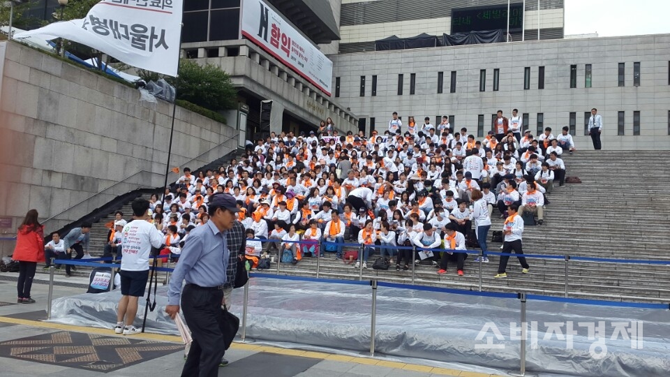 29일 광화문 세종예술아카데미 앞 계단에서 서울대병원 노조가 파업 관련 집회를 하고 있다.