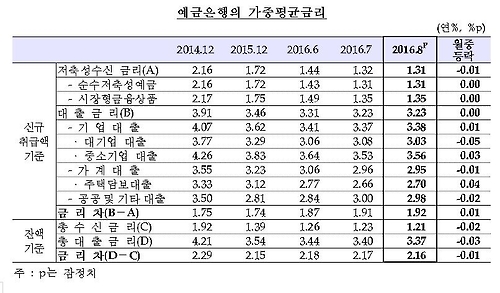 전체 은행 대출의 평균 금리는 3.23%로 변동이 없었던 반면, 저축성 수신금리는 1.31%로 0.01%포인트 떨어지면서 사상 최저치를 또 경신했다.