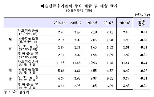 신용협동조합도 예금금리 0.03%포인트, 대출금리 0.07%포인트 하락했고 상호금융은 예금금리가 0.01%포인트, 대출금리가 0.02%포인트 내려간 것으로 나타났다.