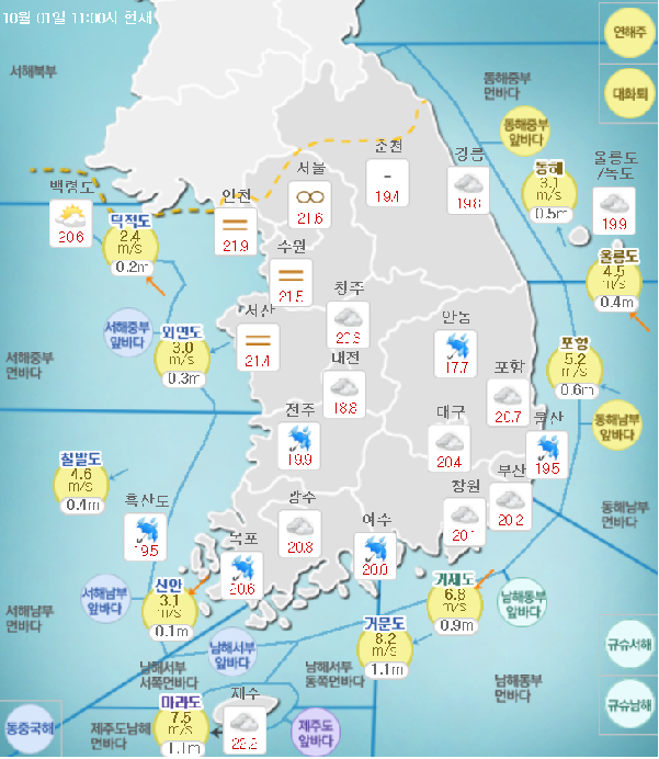 서울 경기도와 강원도는 동해상에 위치한 고기압의 가장자리에 들겠고, 충청도와 남부지방, 제주도는 남해상에 위치한 기압골의 영향을 받겠다. 서울 경기도와 강원도는 구름이 많겠으나, 그 밖의 지역은 흐리고 충청도는 밤부터 제주도는 아침까지 남부지방엔 비가 내리는 곳이 있겠다.