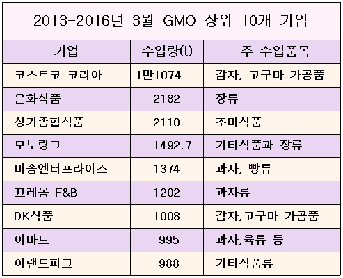 지난 7일 실시된 국정감사에서 김현권 더불어민주당 의원이 2013년에서 2016년 사이 GMO 가공식품 수입 10대 국내 기업을 공개해 큰 반향을 일으켰다.