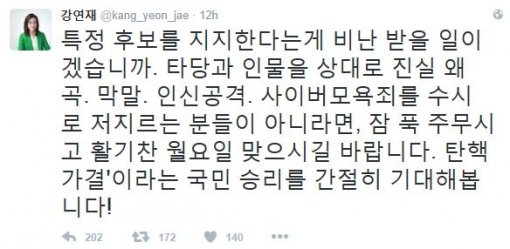 “‘친문·문빠·광신도’들의 진실 왜곡”이라는 트윗글로 한 차례 분란을 불러 일으켰던 강 대변인이 4일 “특정 후보를 지지한다는 게 비난 받을 일이겠느냐”며 다시 트윗 글을 올려 더불어민주당 지도부와 문재인 전 대표의 지지자들을 충동했다.