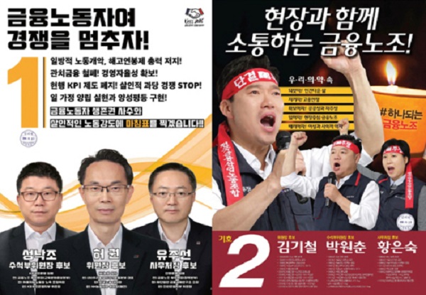 반면 김 후보(기호2번)은 선거 슬로건은 “현장과 함께 소통하는 금융노조”다. 핵심 공약은 “되찾자! 인간다운 삶”으로 요약된다.