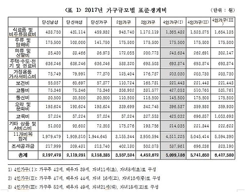한국노총은 25일 일반 가정에서 지출되는 식료품비, 의류비, 교통비, 보건비, 교육비 등 총 12개 항목을 대상으로 산출한 ‘2017년 표준생계비’를 발표했다.