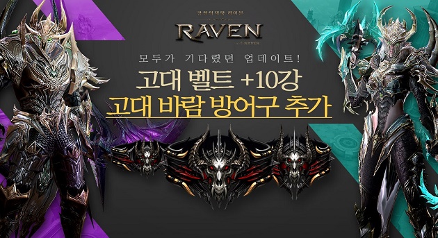 한층 더 강렬한 외형과 능력치를 갖춘 고대 벨트는 휴먼, 엘프, 반고, 릴리스 등 각 캐릭터 별로 7종씩 추가했으며, 장신구 강화석을 사용해 +10단계까지 강화가 가능하다. 장신구 강화석은 장비 분해 또는 헤븐스톤 교환을 통해 획득할 수 있다.