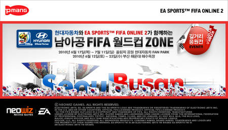 [경제타임즈=최덕환 기자]네오위즈게임즈가 공급하는 ‘FIFA ONLINE 2(이하 FIFA 온라인 2)’에서 현대차와 함께 2010 남아공 FIFA 월드컵 대한민국 대 아르헨티나전의 대규모 거리 응원전을 개최한다고 17일 밝혔다.