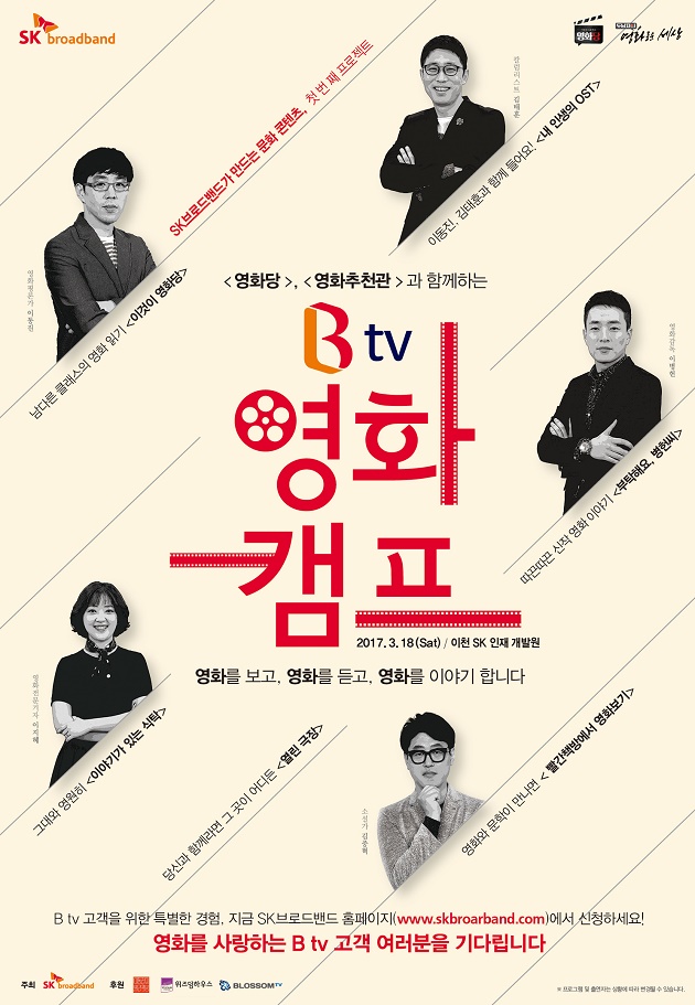 SK브로드밴드는 자체 제작 영화소개 콘텐츠인 ‘영화당’과 ‘영화추천관’의 MC인 이동진 영화평론가, 김중혁 작가,김태훈 칼럼리스트, 이병헌 감독, 이지혜 영화전문기자 등이 고객들과 영화에 대해 얘기하는 자리로 B tv 영화캠프를 마련했다.