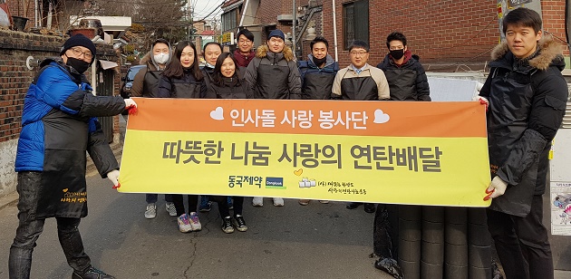 [소비자경제=나승균 기자] 동국제약 '인사돌 사랑봉사단'은 최근 서울시 관악구와 송파구에서 각각 ‘사랑의 연탄나눔’, ‘사랑의 빵나눔’ 봉사활동을 진행했다.