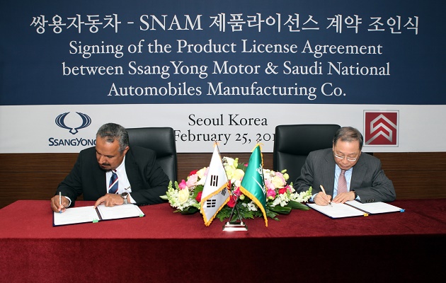 양사는 지난 25일 쌍용자동차 서울사무소에서 쌍용자동차 최종식 대표이사와 SNAM社의 파드 알도히시(Dr. Fahd S Aldohish) 대표 이사가 참석한 가운데 사우디아라비아 현지 조립생산을 위한 제품 라이선스 계약 체결식을 가졌다.