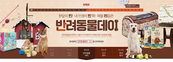 위메프는 반려동물 상품을 찾는 고객들을 위해 매월 15일을 ‘반려동물데이’로 지정, 다양한 아이템을 선보일 예정이다.