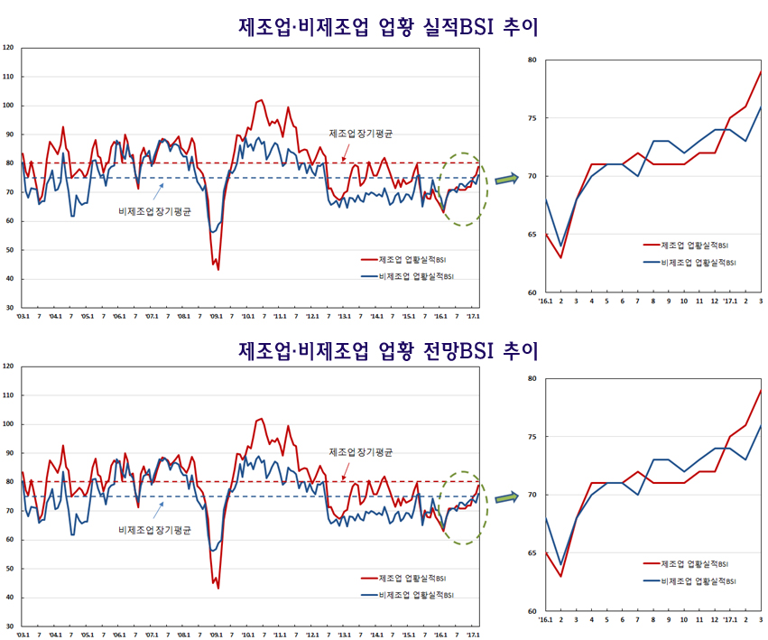 한국은행은 29일 “3월 제조업의 업황 기업경기실사지수 BSI가 79로 지난달보다 3포인트 올랐다”고 밝혔다. 제조업의 업황BSI는 지난해 12월 72에서 올해 1월 75, 2월 76으로 오른 데 이어 석 달 연속 상승했다.