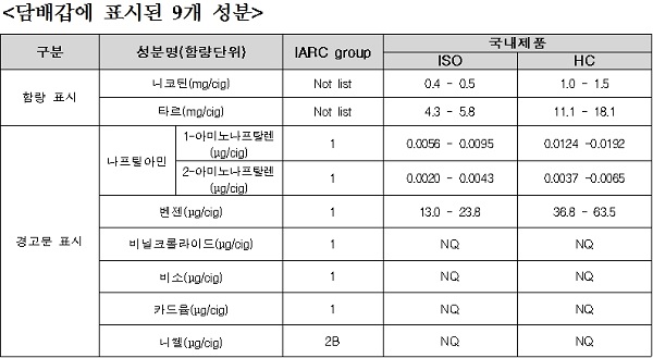 특히 이번에 검출된 발암물질 중에는 담배갑에 표시 경고된 것이 아닌 성분이 9종이나 검출돼 표시 규정에 대한 논란이 예상된다.